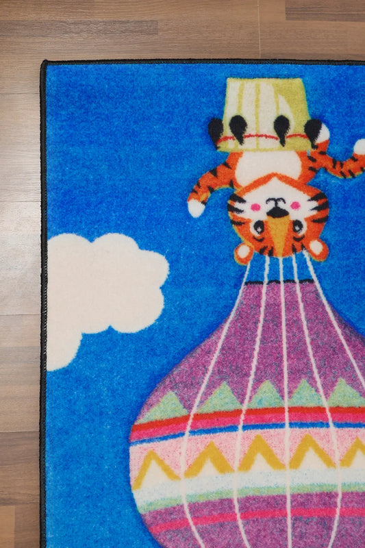 Blue With Multi Color Hot Air Baloon & Animals Drawing Print Rug