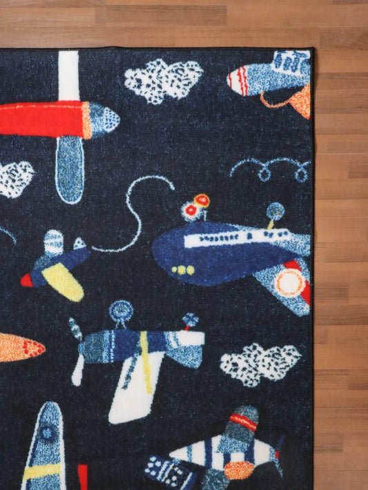 Dark Blue Multi Color Airplanes Print Rug